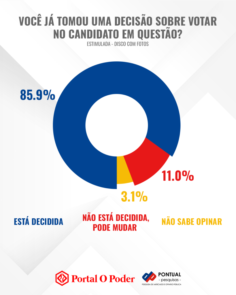A pesquisa Pontual revela que 85,9% dos eleitores em Tefé já têm seu candidato definido para o pleito de outubro. Além disso, 11,0% dos eleitores afirmam estarem decididos, mas admitem a possibilidade de mudar de voto. Apenas 3,1% dos entrevistados não souberam opinar.