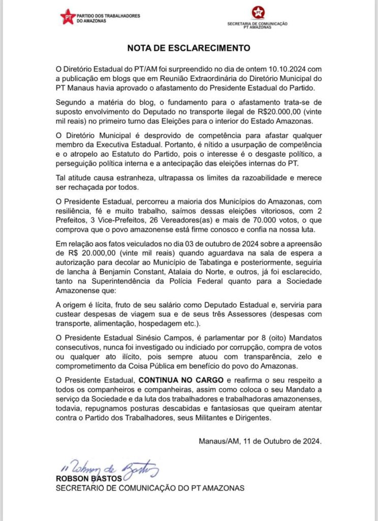 Além disso, a diretoria defendeu a origem lícita dos R$ 20.000,00 apreendidos, esclarecendo que o montante era destinado a cobrir despesas de viagem do presidente e seus assessores. Sinésio Campos, que tem se mostrado ativo na condução de campanhas vitoriosas no estado, reafirmou sua continuidade no cargo e seu respeito pelos militantes e dirigentes do partido. O PT/AM finaliza a nota repudiando quaisquer posturas que possam prejudicar a imagem do partido e de seus integrantes, assegurando que a luta pelos trabalhadores e trabalhadoras do Amazonas continuará firme.