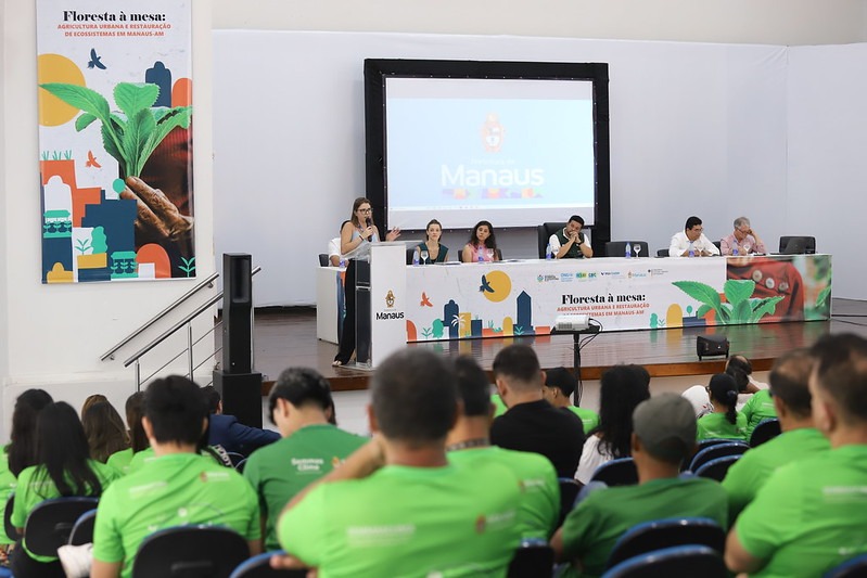 Manaus celebrou o Dia Mundial do Meio Ambiente, nesta quarta-feira, 5/6, com o evento “Floresta à Mesa: agricultura urbana e restauração de ecossistemas em Manaus”, que reuniu representantes do poder público, sociedade civil e instituições nacionais e internacionais no auditório da Prefeitura de Manaus, firmando o compromisso do município no desenvolvimento de um amplo programa de hortas urbanas e periurbanas. Esta é mais uma das iniciativas da gestão, que tem como foco a melhoria da qualidade de vida da população, a redução das ilhas de calor e o incentivo ao desenvolvimento de uma alimentação natural e de qualidade.