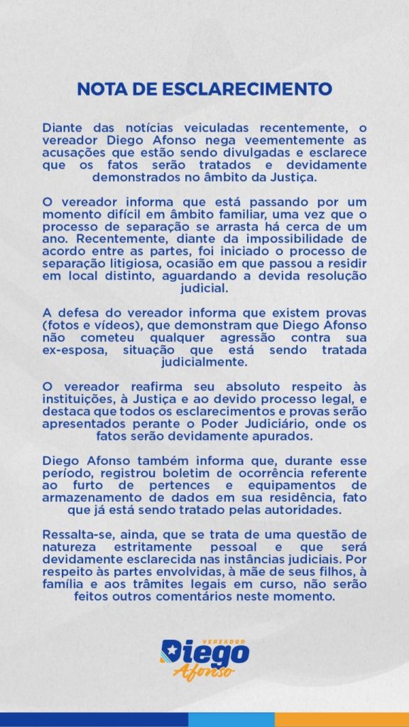 A defesa do vereador informa que existem provas (fotos e vídeos), que demonstram que Diego Afonso não cometeu qualquer agressão contra sua ex-esposa, situação que está sendo tratada