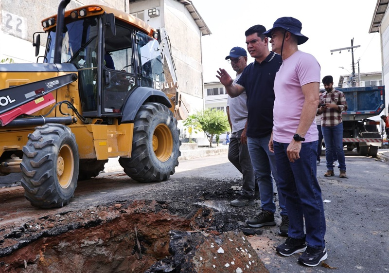 O prefeito de Manaus, David Almeida, vistoriou, nesta segunda-feira, 19/8, o serviço de manutenção da rede de drenagem do conjunto Tocantins, no bairro Chapada, na zona Centro-Sul da cidade. A substituição dos tubos é feita pela Secretaria Municipal de Infraestrutura (Seminf).