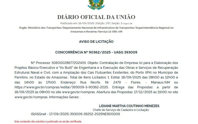Com a publicação do edital, o processo segue agora para as etapas de recebimento das propostas, julgamento e assinatura do contrato. A expectativa é que, concluído o trâmite, as obras tenham início ainda este ano, ampliando a capacidade operacional e fortalecendo a segurança das operações fluviais.