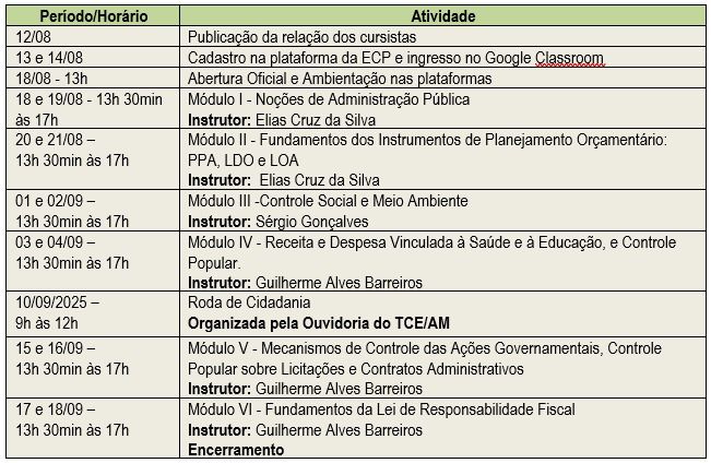 O Tribunal de Contas do Amazonas (TCE-AM), por meio da Escola de Contas Públicas (ECP), prorrogou até o dia 7 de agosto as inscrições para a edição 2025 do Programa de Formação de Agentes de Controle Social (Profac).
