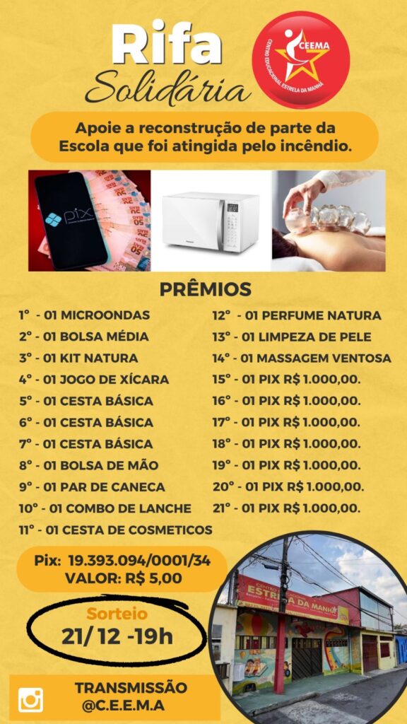 Rifa Solidaria em prol Reconstrução de escola que foi destruída em incêndio